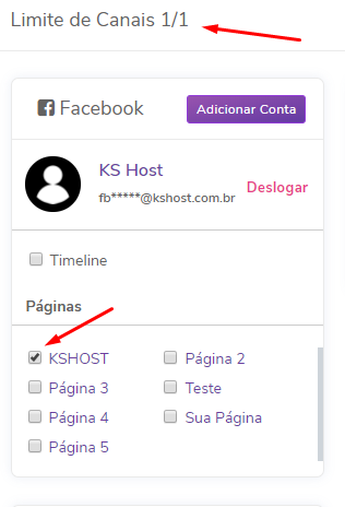 Finalizando este processo irá mostrar sua conta conectada na aba Facebook com as páginas, basta selecionar a(s) página(s) que deseja transmitir na caixa de seleção de acordo com o limite de canais do seu plano que mostra no canto superior.