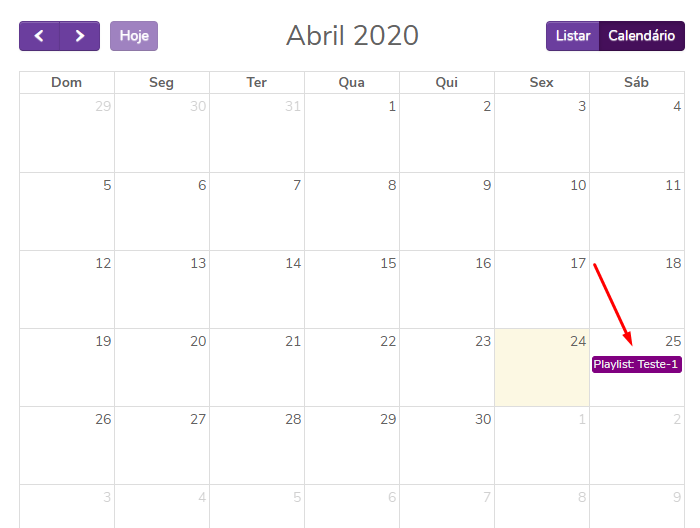 Quando estiver cadastrado irá exibir no calendário a playlist no dia em que fez o agendamento.